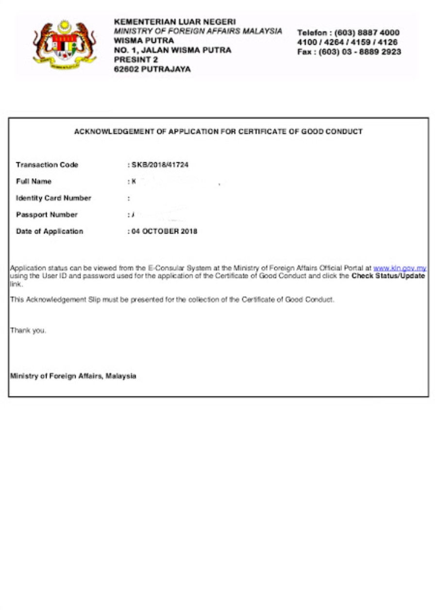 Malaysia Police Clearance ( Certificate Of Good Conduct)